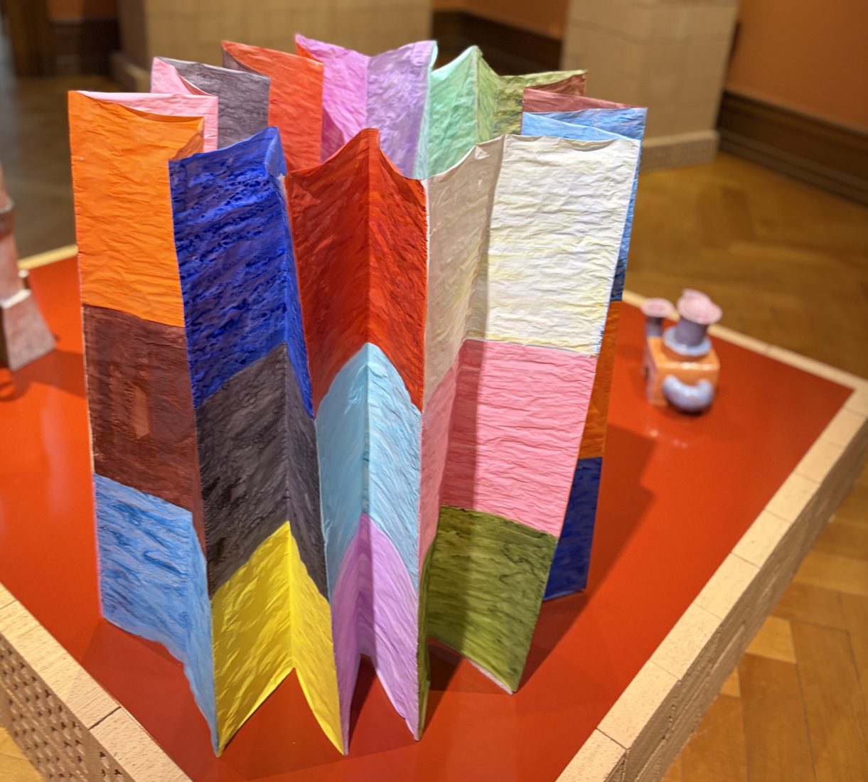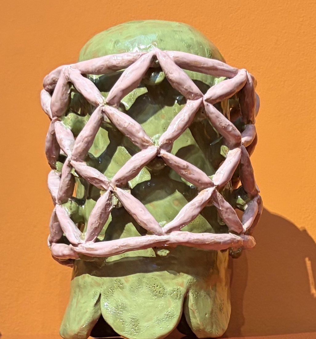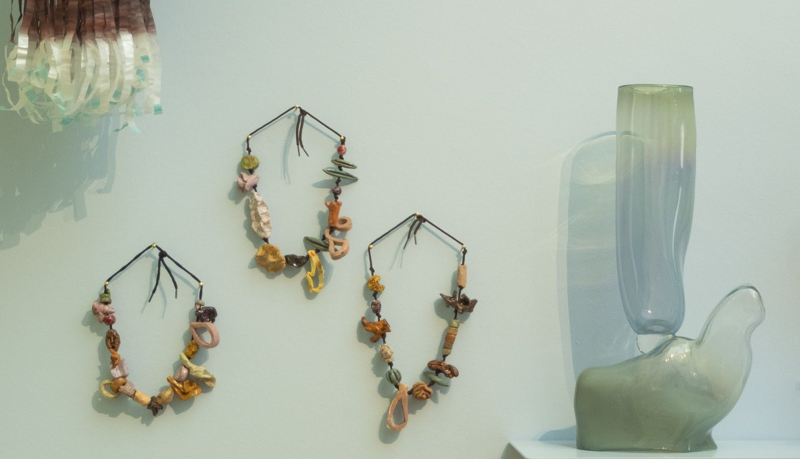 Pour Marie Ducaté, tout est occasion de création. Ses recherches de décor et de tonalités prennent forme sur des petits carreaux gardés précieusement et de dessins esquissés non au crayon mais à l’aquarelle. L’exposition « Marie Ducaté. Simultanés » présente des broches (2020–2024), des colliers en corde et céramique, 2023, 2024, 2025, et même un chapeau à franges, en papier calque, fruits d’une énergie créative.