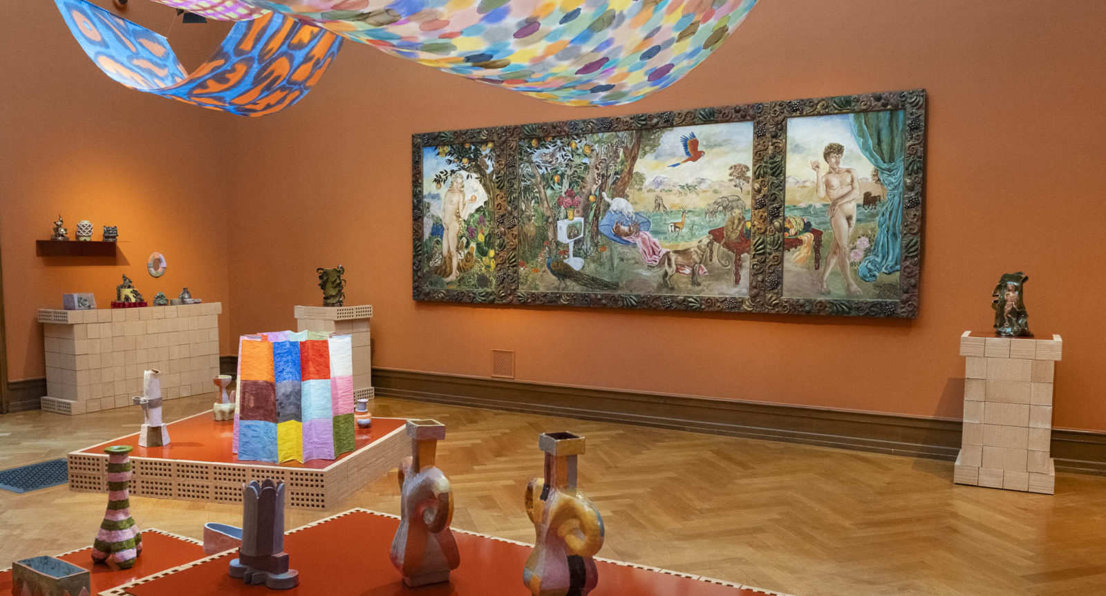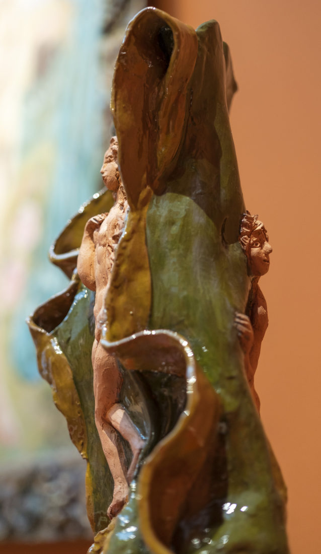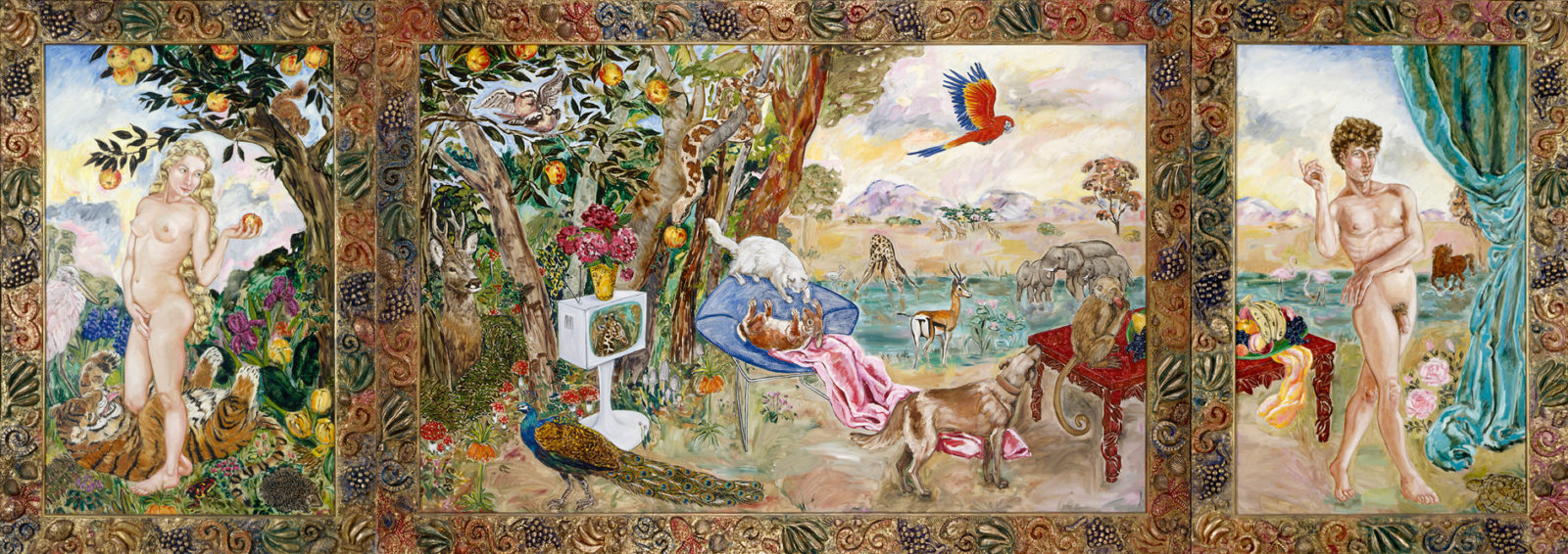 Marie Ducaté se dit très heureuse de la présence de son triptyque datant de 1985 et représentant le Paradis à la Télé. Références à l’histoire de l’art, Gauguin et Picasso. Une télévision, clin d’œil drôle, en souvenir des documentaires sur les animaux regardés et appréciés dans son enfance “Un outil qui pouvait être bien”. Le déhanché très prononcé d’Adam est inspiré de Lucas Cranach l’Ancien. Le cadre, quant à lui, est composé de petites sculptures en résine, au glacis recouvert de bronze. Le serpent, animal tentateur dans le récit de la Bible, et créature associée à la femme dans différentes cultures païennes anciennes, se place dans le panneau central à équidistance des protagonistes humains. Ève (autoportrait de l’artiste réalisé sur la base d’une photographie) enjambe un tigre joueur qui cohabite avec d’autres créatures espiègles sur un fond de savane où figurent des meubles design.