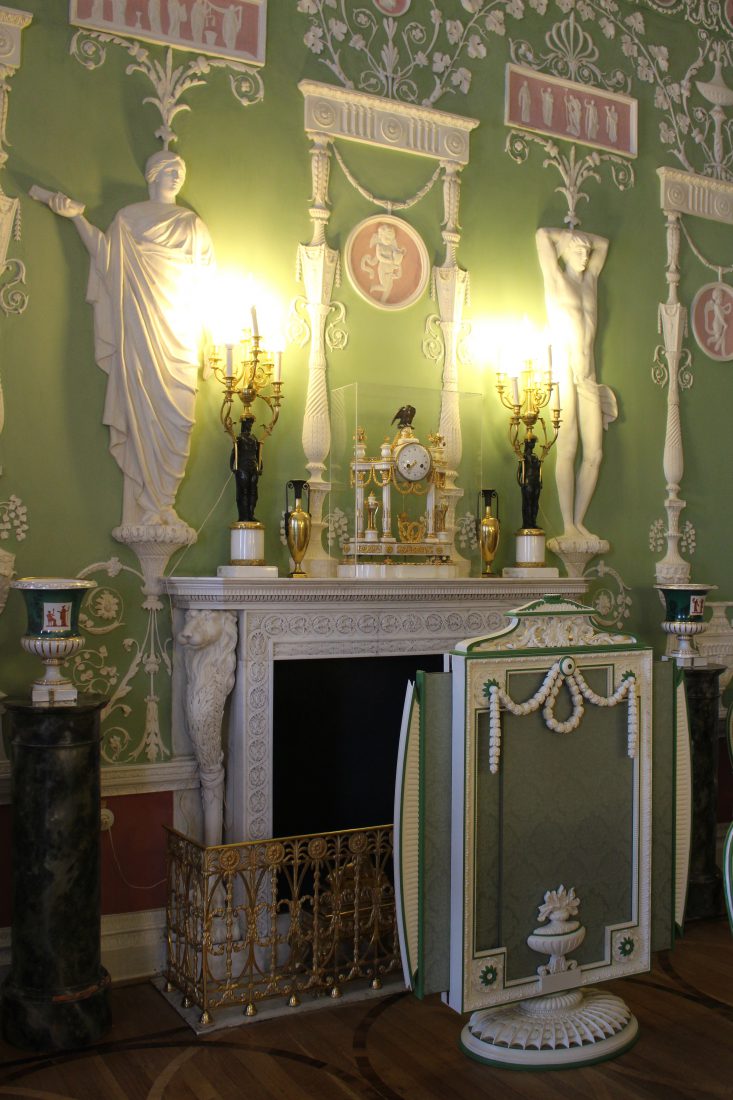 La Chambre Rouge et la Chambre Verte sont nommées ainsi en raison des couleurs choisies par Rastrelli pour habiller les colonnes décoratives destinées à trancher sur les murs tendus de tissu damassé blanc. Sur une table basse, un magnifique jeu d’échecs du XVIIIème de fabrication chinoise, en marqueterie incrustée de nacre avec des figures en ivoire sculpté.